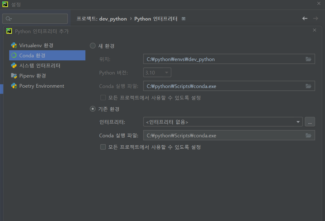 2. python 인터프리터 화면에서 톱니바퀴 버튼클릭 → 추가 → conda환경 순으로 클릭