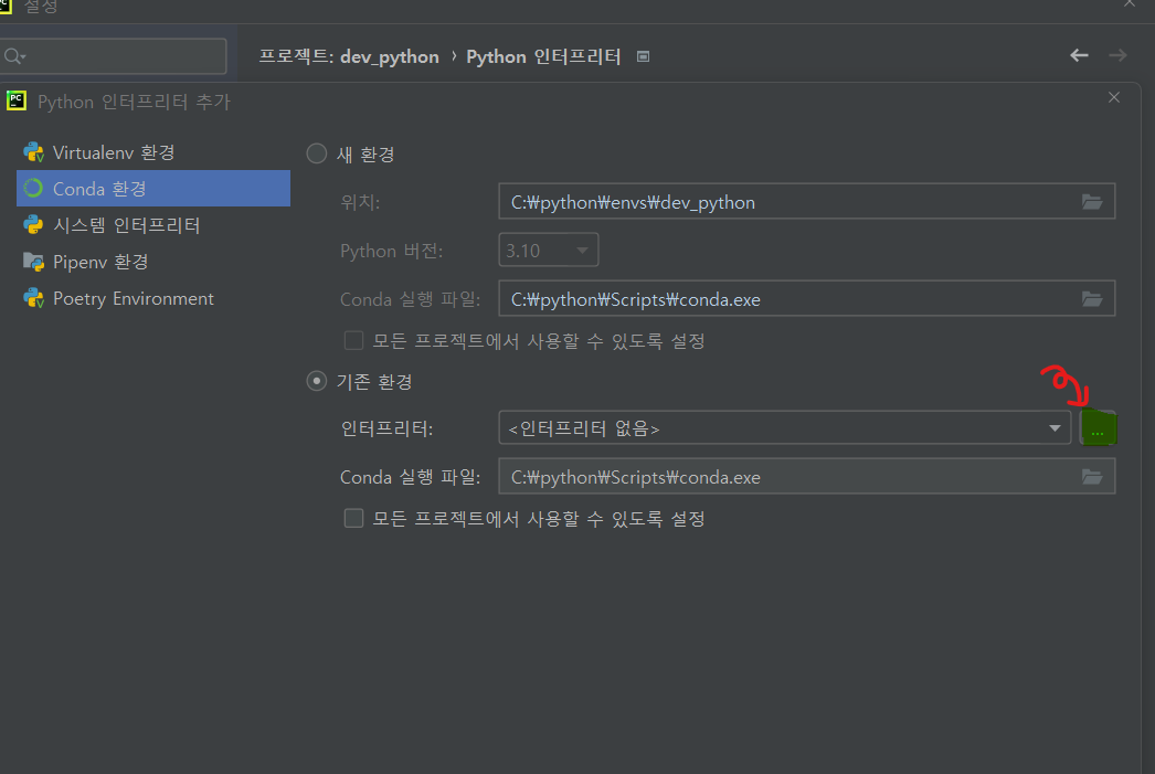 3. 기존환경탭 → 인터프리터 부분에 ... 버튼 클릭
